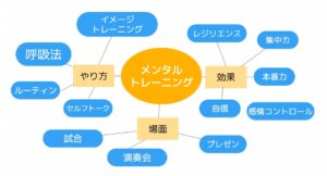 メンタルスキルとは、具体的には「平常心」「集中力」「自信」「セルフコントロール」「イメージ力」といった、本番で力を発揮するために必要な心理的能力のこと。